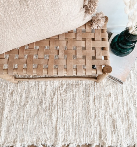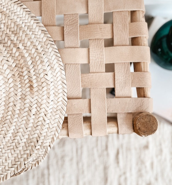 Ce petit banc en bois à la fois authentique et naturel rappelle le climat chaud du Maroc. Son assise en cuir tressé le rend confortable et original.